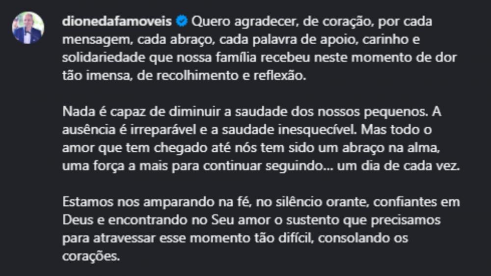 “Quero agradecer por cada palavra de solidariedade. Nada é capaz de diminuir a saudade dos nossos pequenos. A ausência é irreparável”, escreveu.